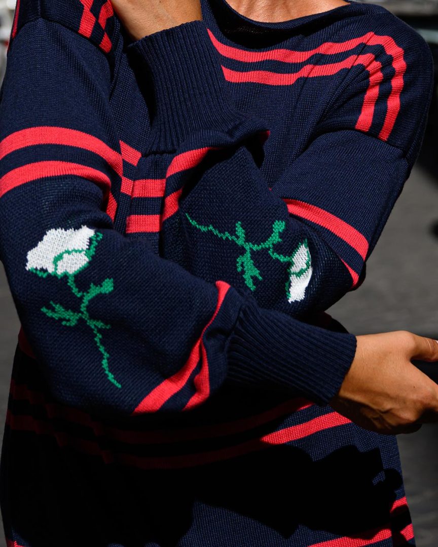 - Sleeves with jacquard flower and puff finish