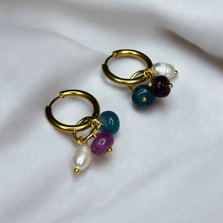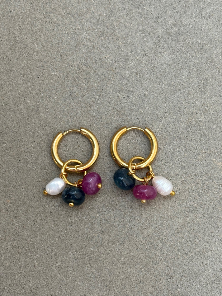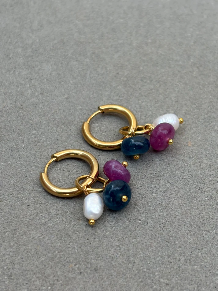 Handmade steel earrings with blue and purple stones and natural pearl. The charms hang from a gold-plated steel hoop and are detachable so you can wear them alone!