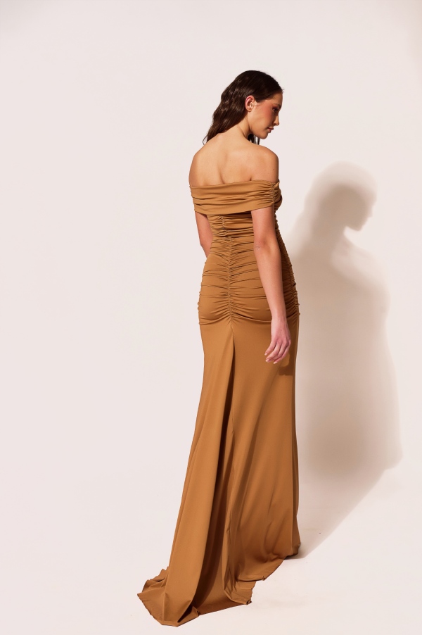 Made from stretch jersey fabric, the Carmel Maxi Dress hugs the body, while the side ruffles accentuate the feminine line and highlight the silhouette. The impressive tail at the back makes it even more impressive, without losing its simplicity and timeless elegance.