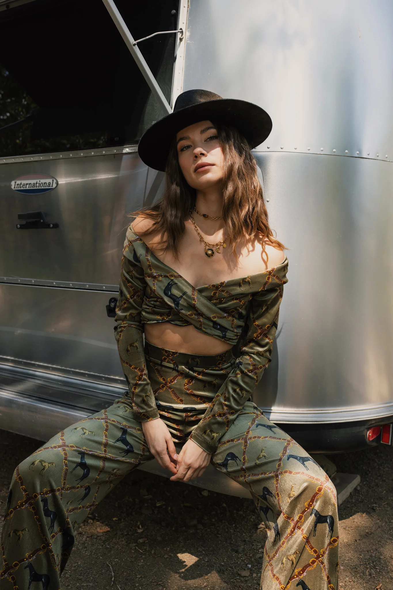 Short velvet top with long elastic sleeves and dropped shoulders.