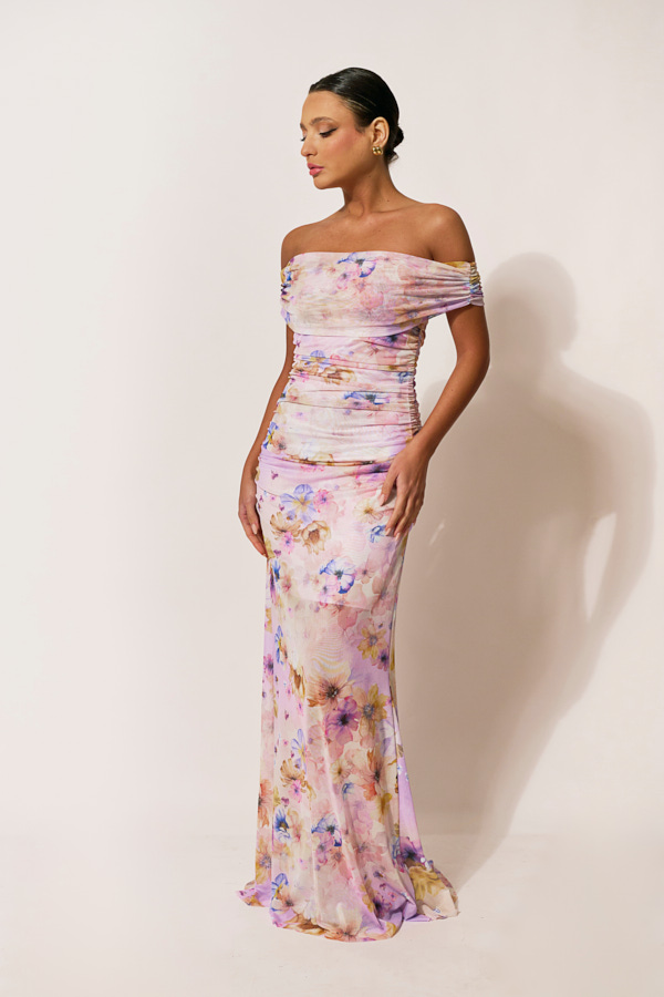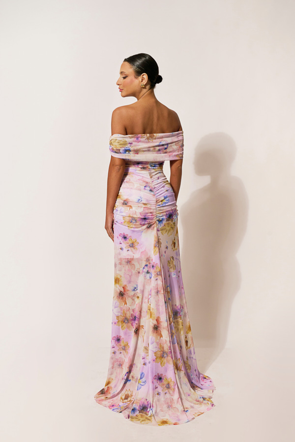 The Lilian Maxi Mesh Dress is one of our favorite best sellers, which returns this year in new, enchanting shades! Made of stretchy tulle, with a romantic off-shoulder cut and a light train that follows your every move, it is an ideal choice for special appearances. The floral print in lilac and pink shades adds an ethereal and romantic aura to the ensemble, while the elastic fit hugs the body flatteringly.