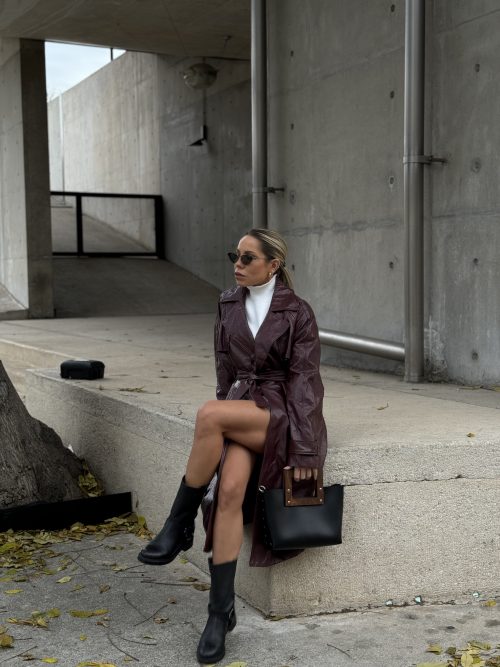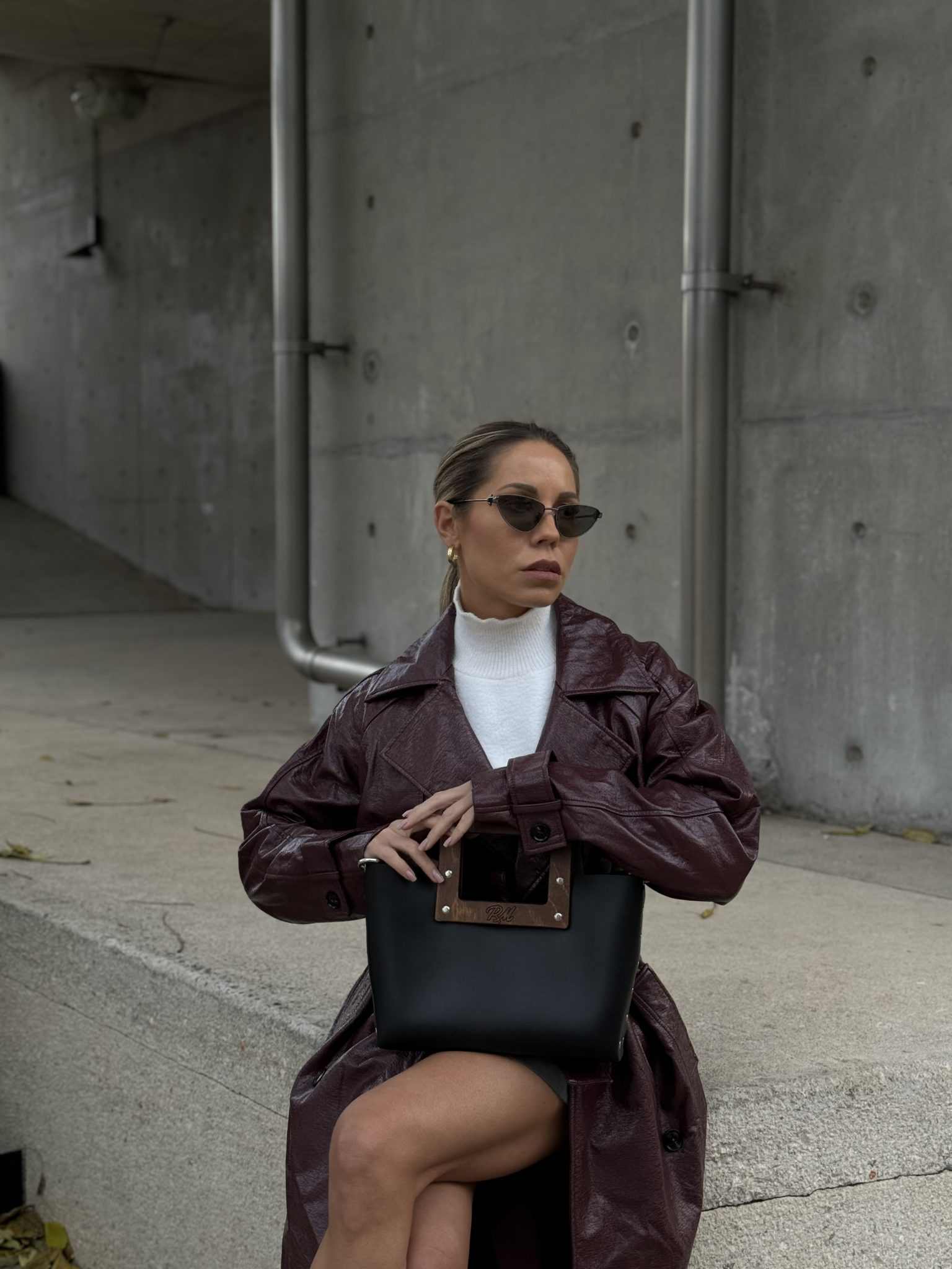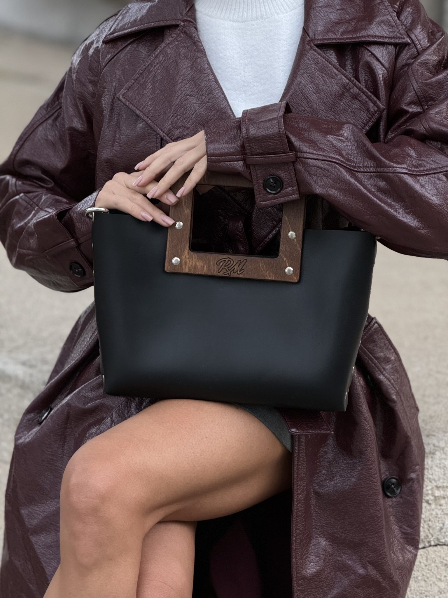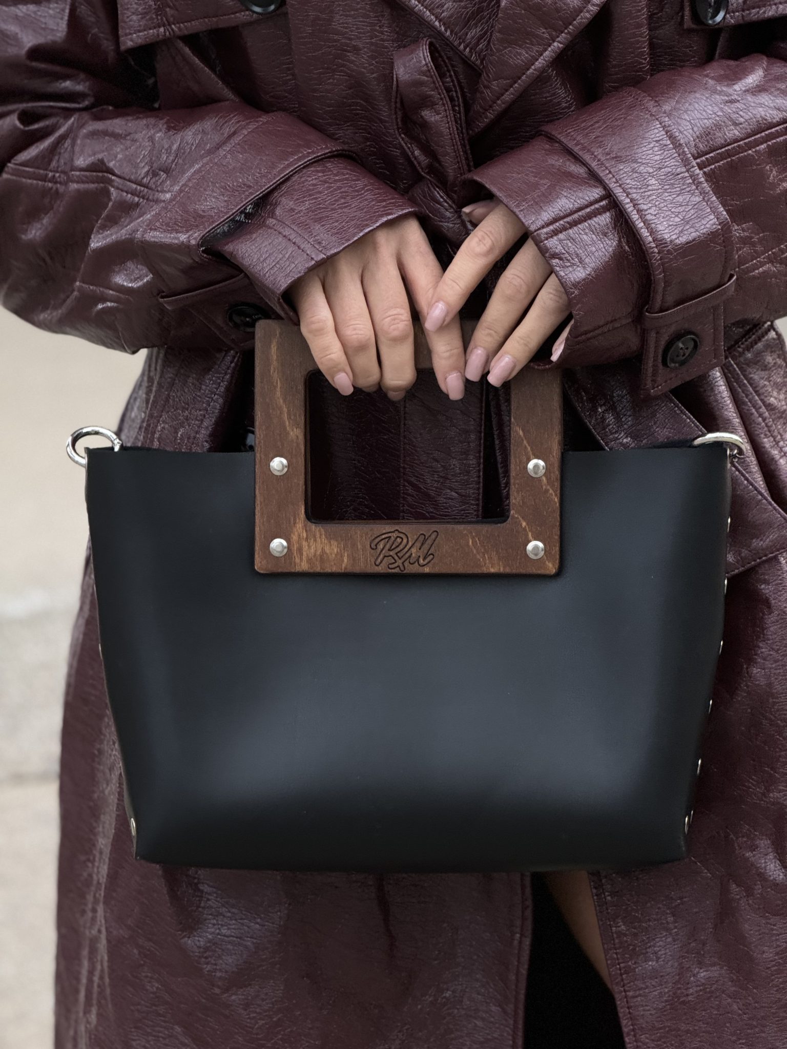 Handmade leather bag with a wooden square handle, featuring an adjustable genuine leather strap