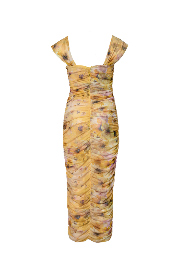 The Soleia Midi Mesh Dress is a fitted women's dress made of stretch tulle, with a floral print in shades of yellow. The mid-calf length and fit enhance the silhouette, while the lining on the inside offers comfort and stability. Ideal for events and special occasions.