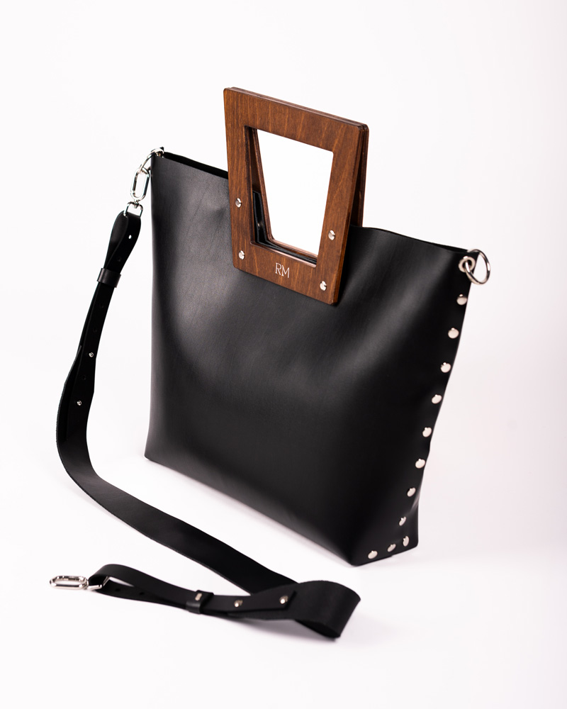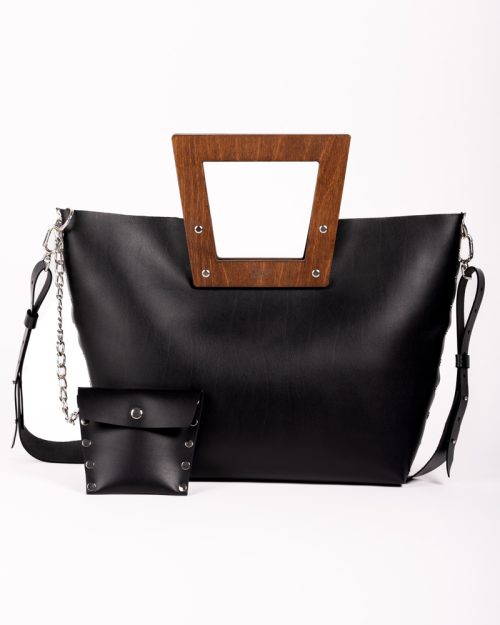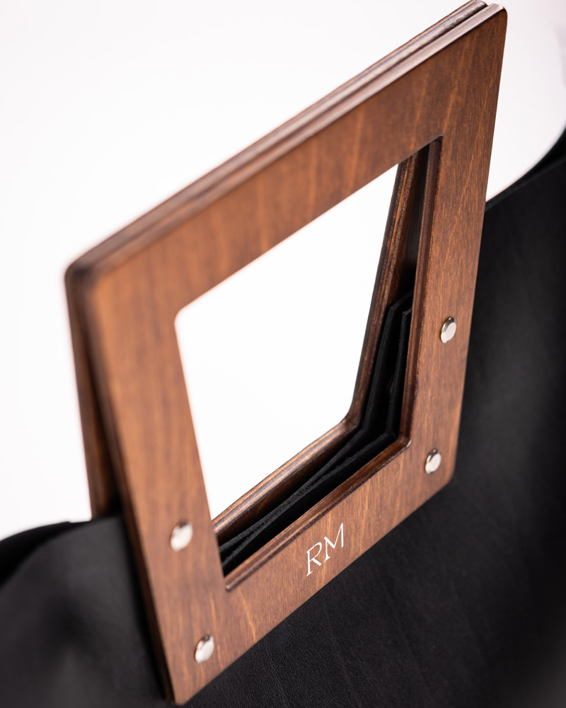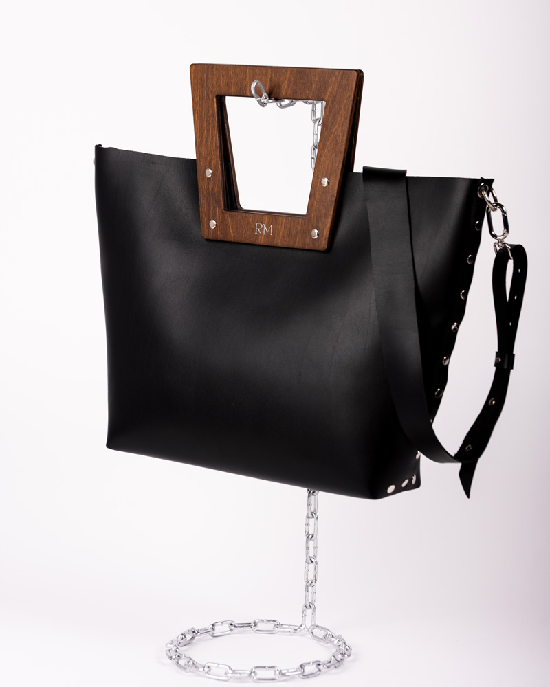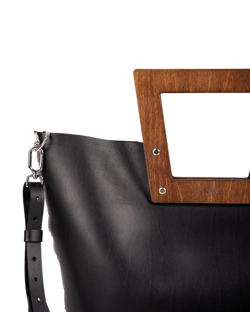 A bag that is a true style statement and embodies the philosophy of “Wearable Art”. This unique handmade bag, where modern aesthetics meet excellent craftsmanship, is made of high quality genuine leather. It is designed for the woman who appreciates elegance but does not compromise on her dynamism. The eye is immediately drawn to the impressive, geometric wooden handle, a work of art made of natural wood, while the modern metal details (trunks) on the side add a subtle rock touch.