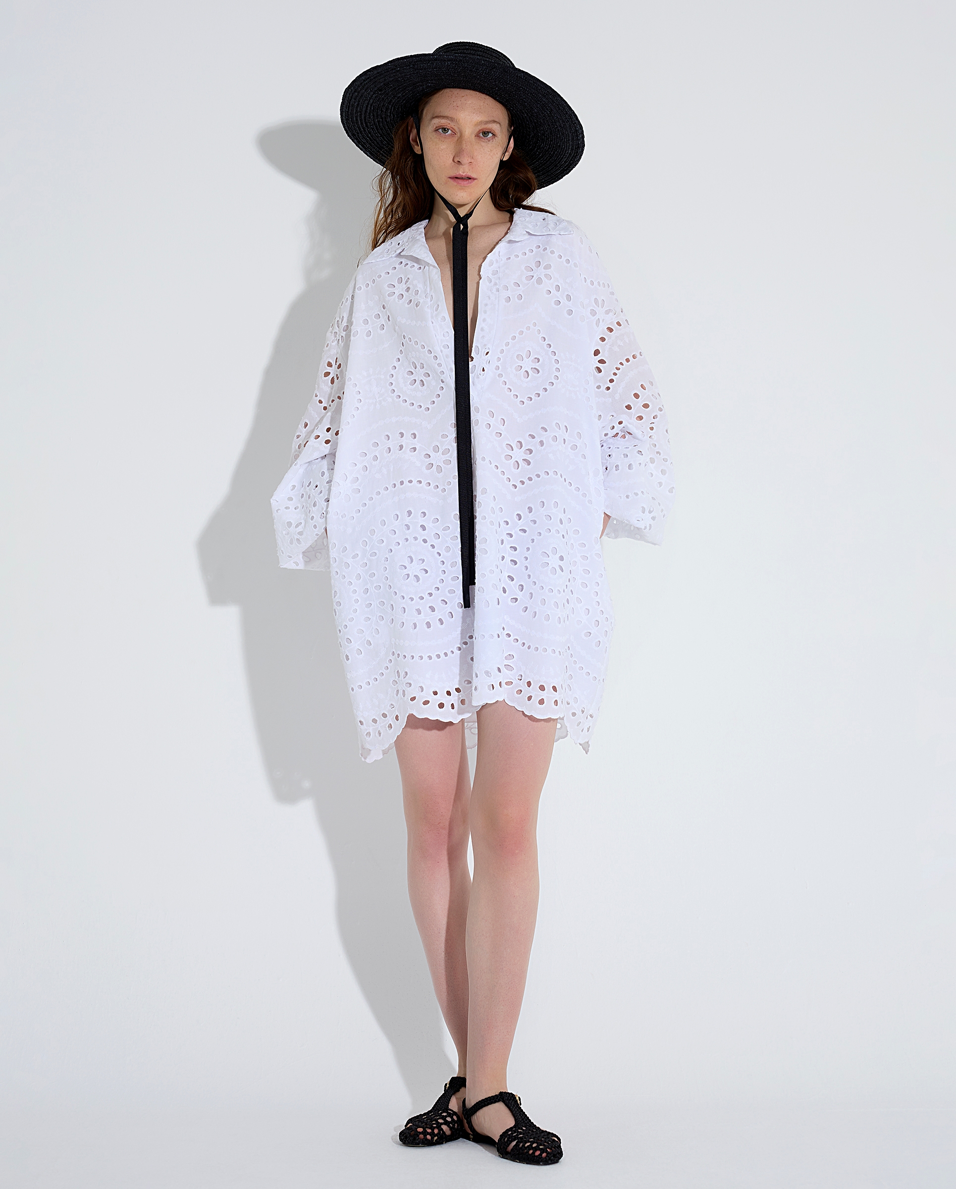 Αέρινο λευκό φόρεμα από δαντέλα τύπου broderie anglaise με φαρδιά γραμμή και V ντεκολτέ. Ιδανικό για καλοκαιρινές αποδράσεις και ανάλαφρα resort looks.