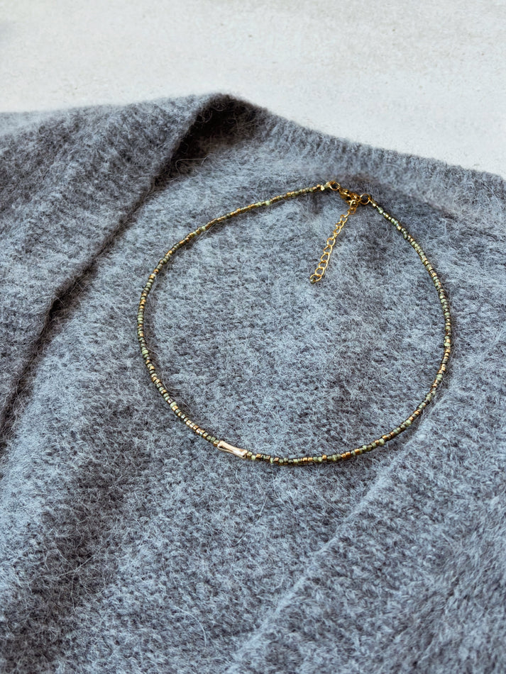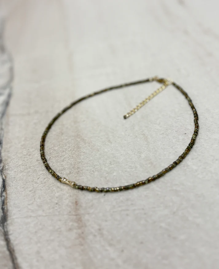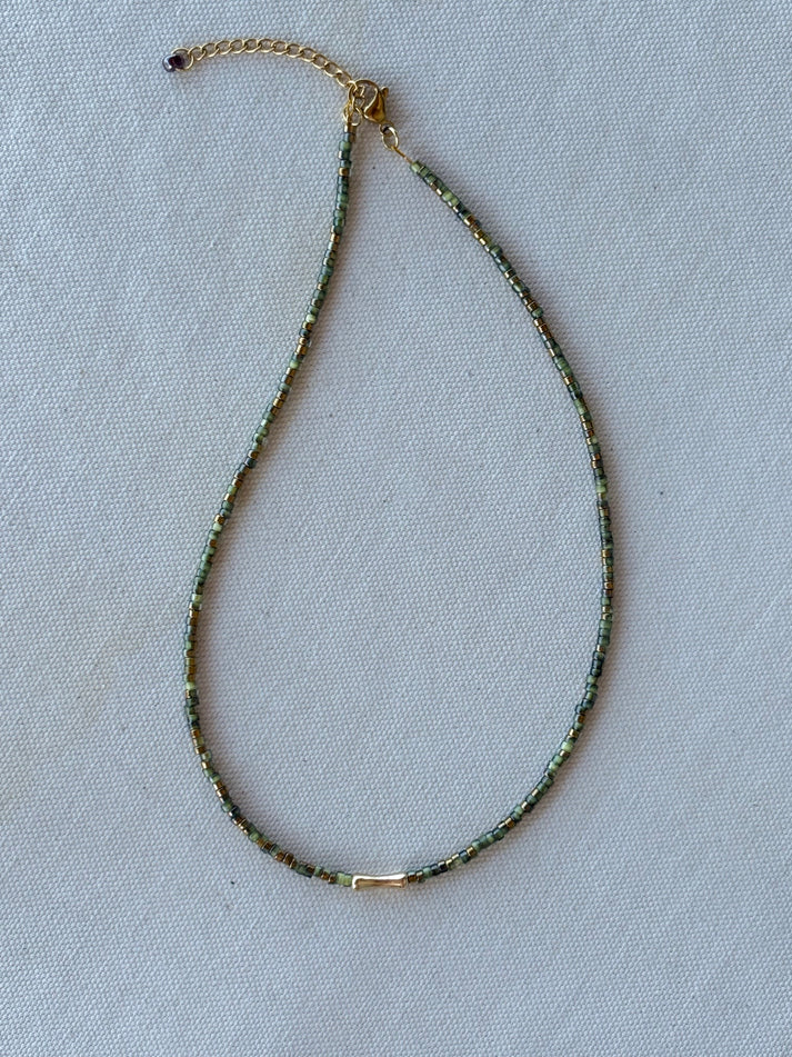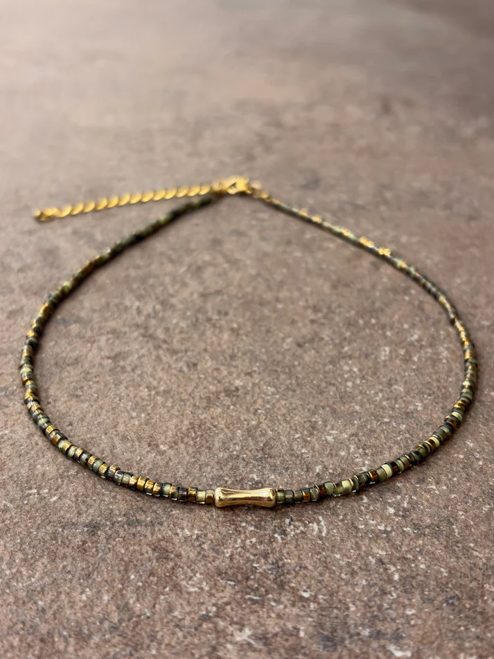 Το Emerald Necklace είναι χειροποίητο από επιχρυσωμένο ανοξείδωτο ατσάλι και στολισμένο με πράσινες και χρυσές γυάλινες χάντρες. Στο κέντρο του, ένα ανοξείδωτο διακοσμητικό στοιχείο σε χρυσό χρώμα. Ένα statement κομμάτι που φοριέται άνετα μόνο του ή συνδυάζεται τέλεια σε layering με τις αγαπημένες σου χρυσές αλυσίδες!