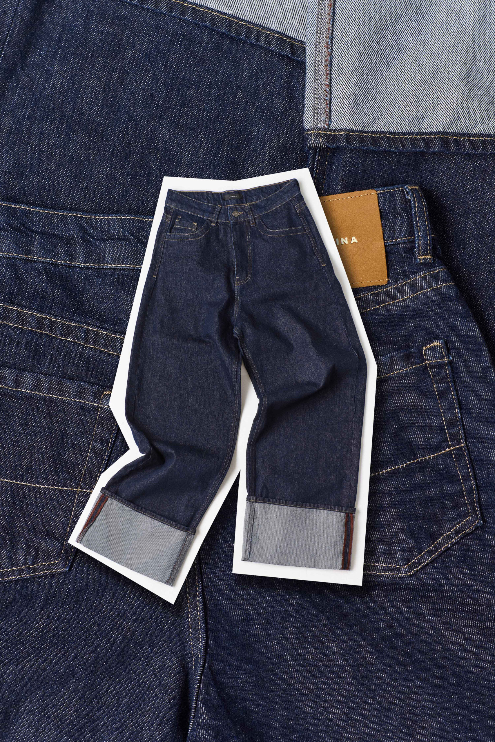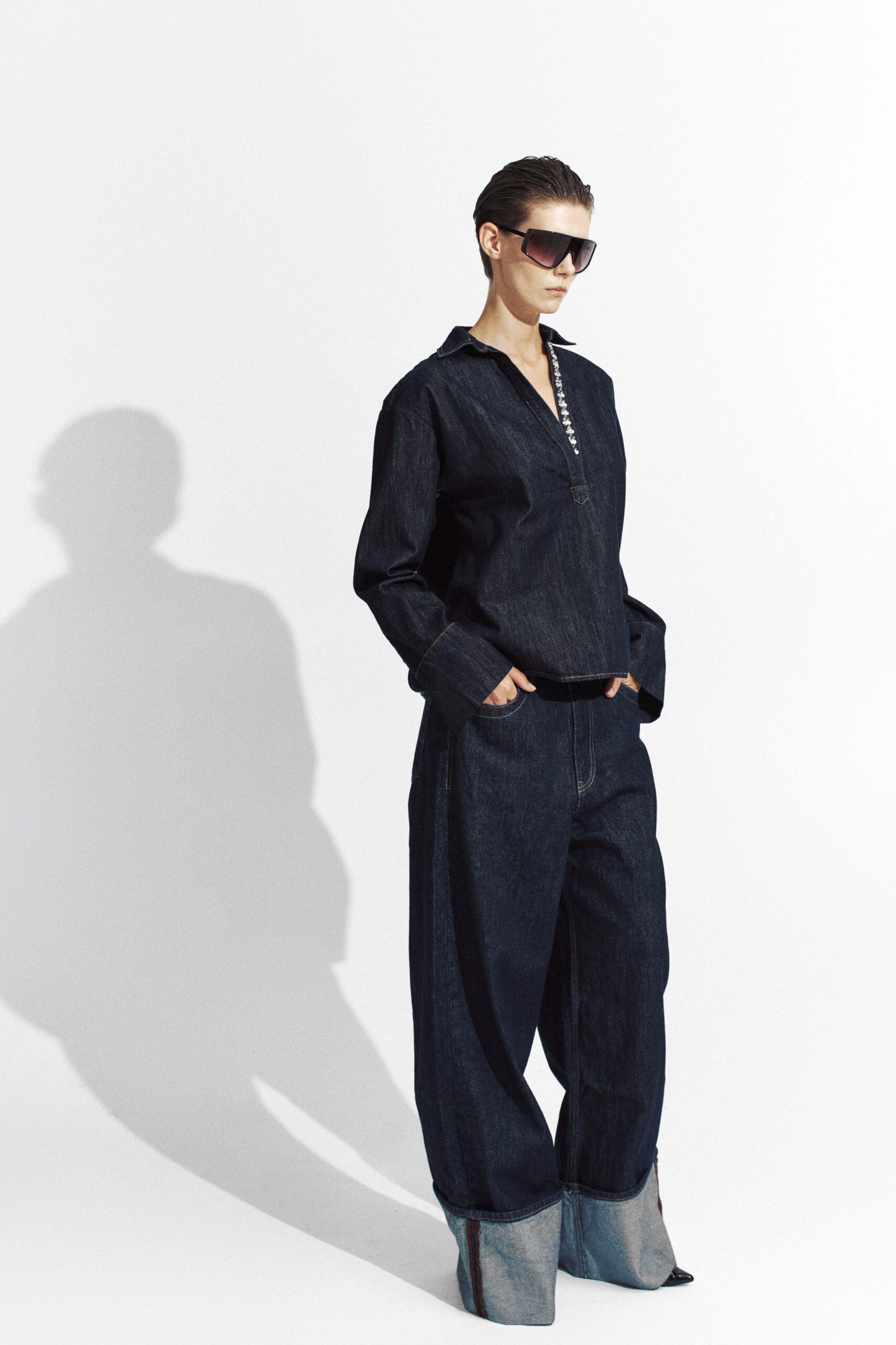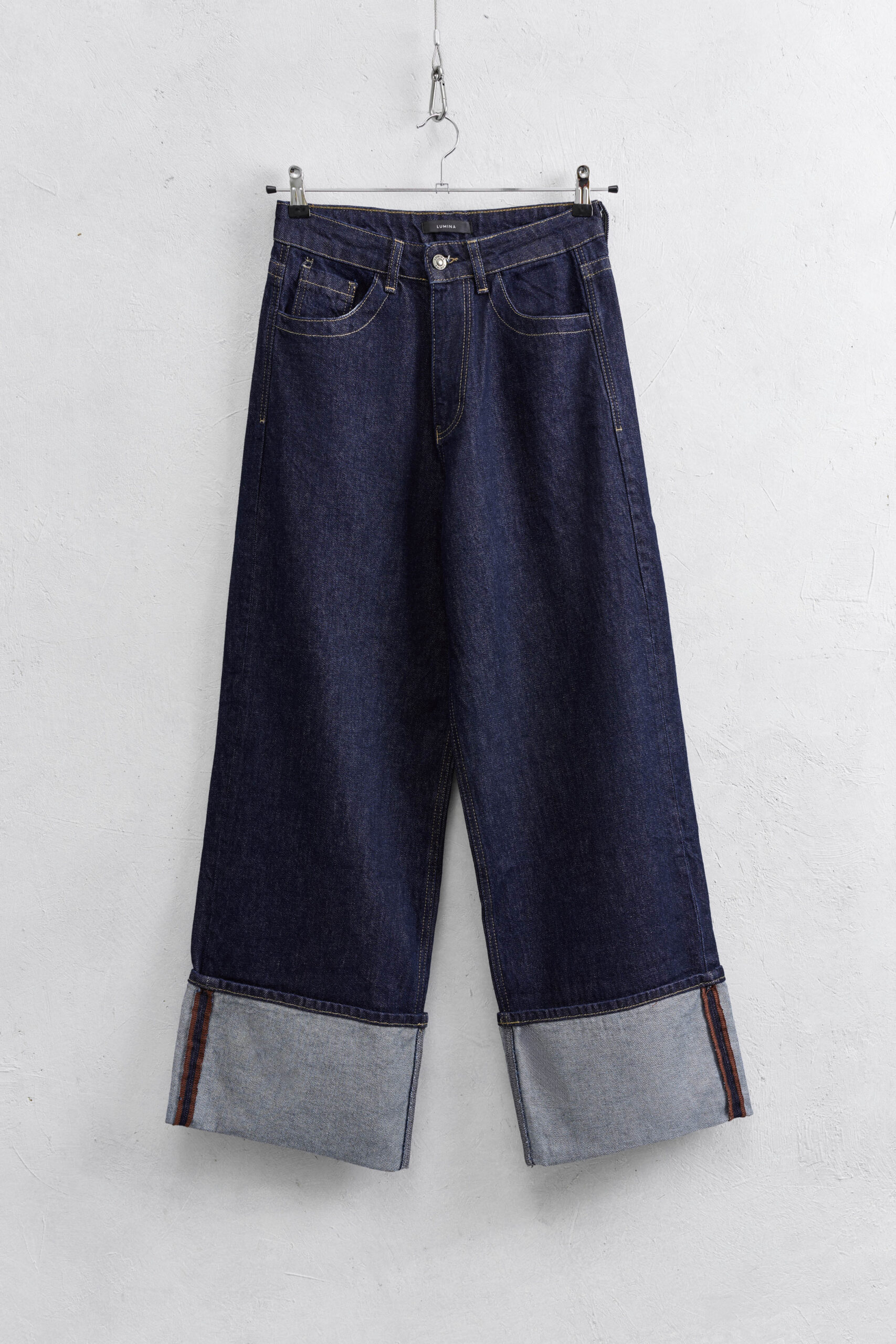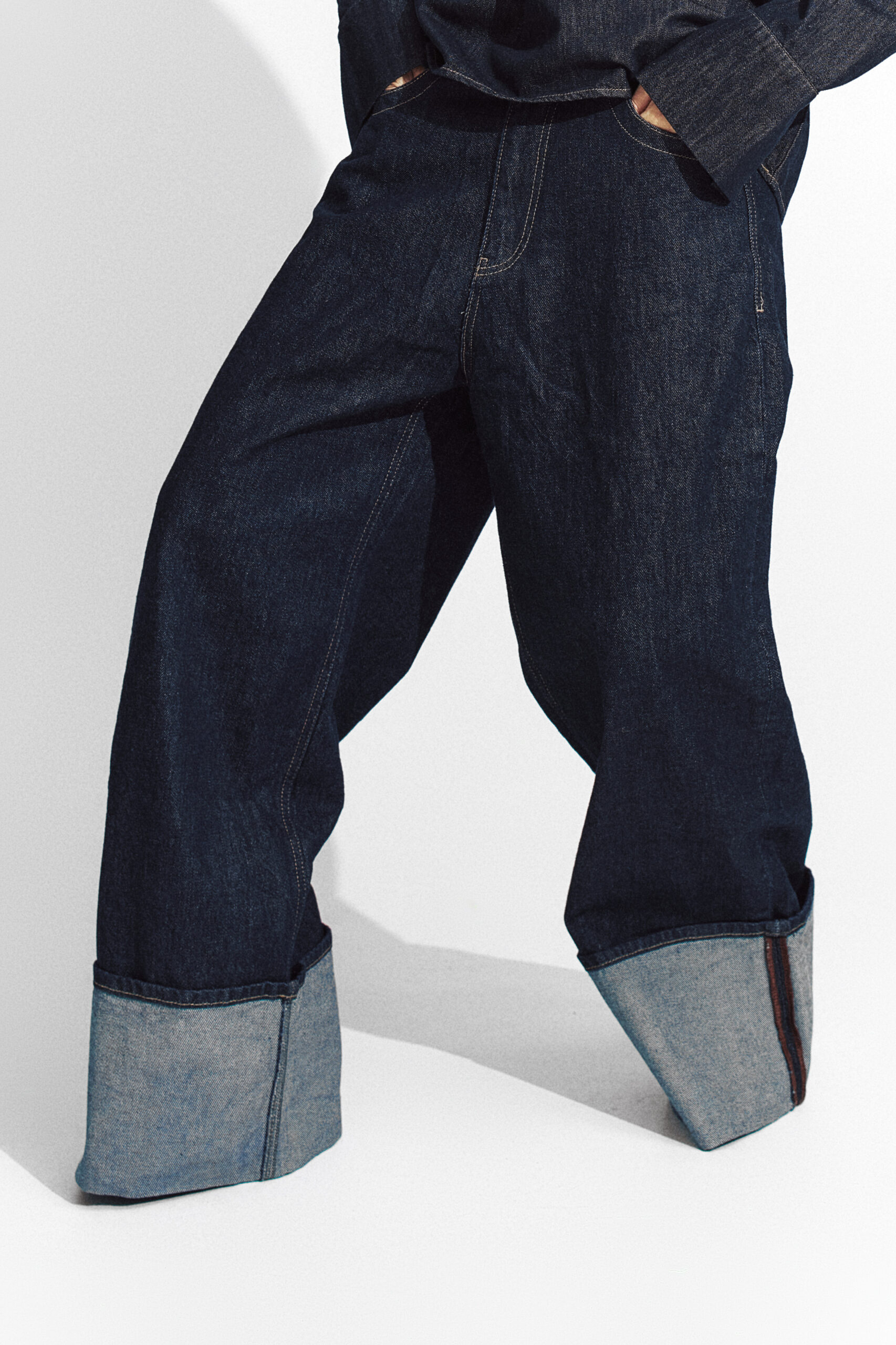 Wide-leg denim trousers. It features a front zip and button fastening. Front and back pockets. Turn-up detail on the hem.