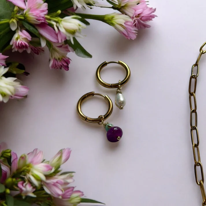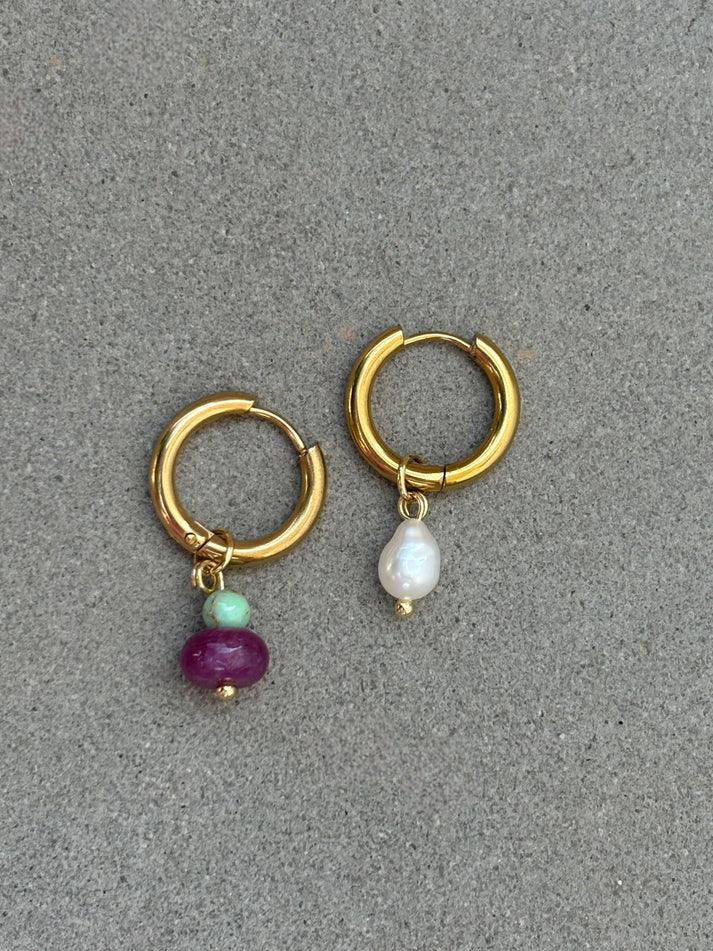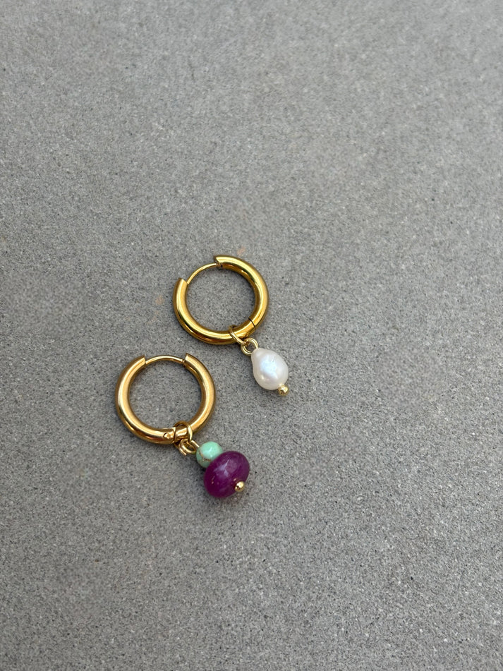 Ζευγάρι σκουλαρίκια με αποσπώμενα charms από τιρκουάζ ίασπι, πορφυρό νεφρίτη και φυσικό μαργαριτάρι. Κρίκοι από ανοξείδωτο ατσάλι επιχρυσωμένο.