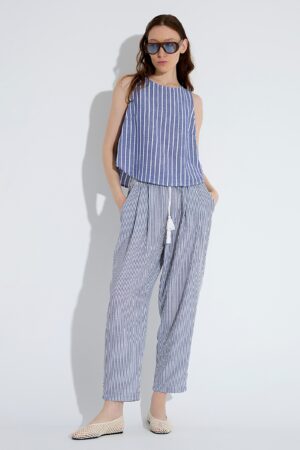 Αμάνικη ριγέ μπλούζα σε χαλαρή γραμμή με στρογγυλή λαιμόκοψη. Ανάλαφρη και δροσερή, ιδανική για καλοκαιρινές εμφανίσεις με στυλ.